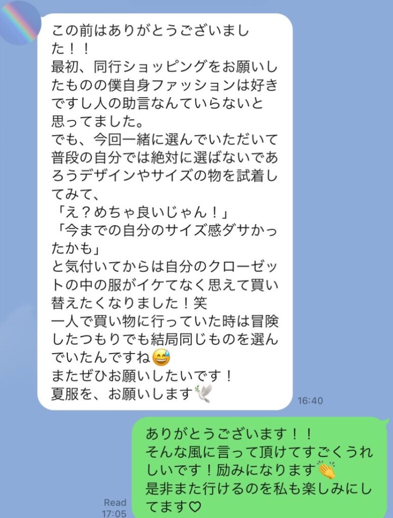 今回の同行ショッピングでは、パーソナルカラー診断結果を元にお洋服を選んでいくことで選ぶ側も迷い過ぎない、そのメリットは男性は特に女性程ショッピングに時間をかけたくない方が多いです。更には、買う服を予め決めてからその決まった服だけを買う。