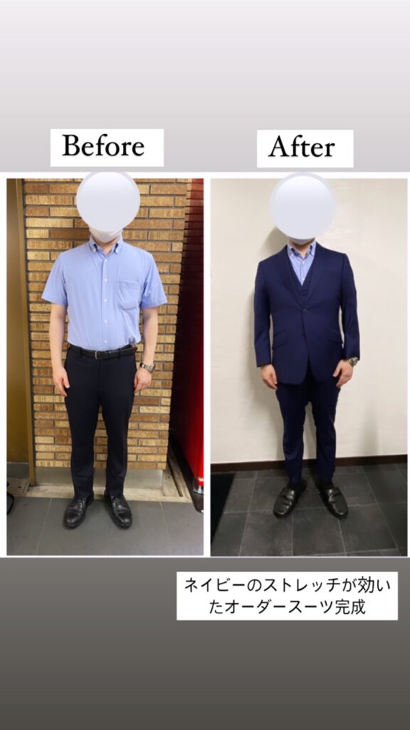 お色も艶っぽいネイビーで生地も滑らかな肌触り。さすがオーダースーツ!サイズ感もバッチリでお色もお客様のお顔写りも若々しくセクシーな印象に✨