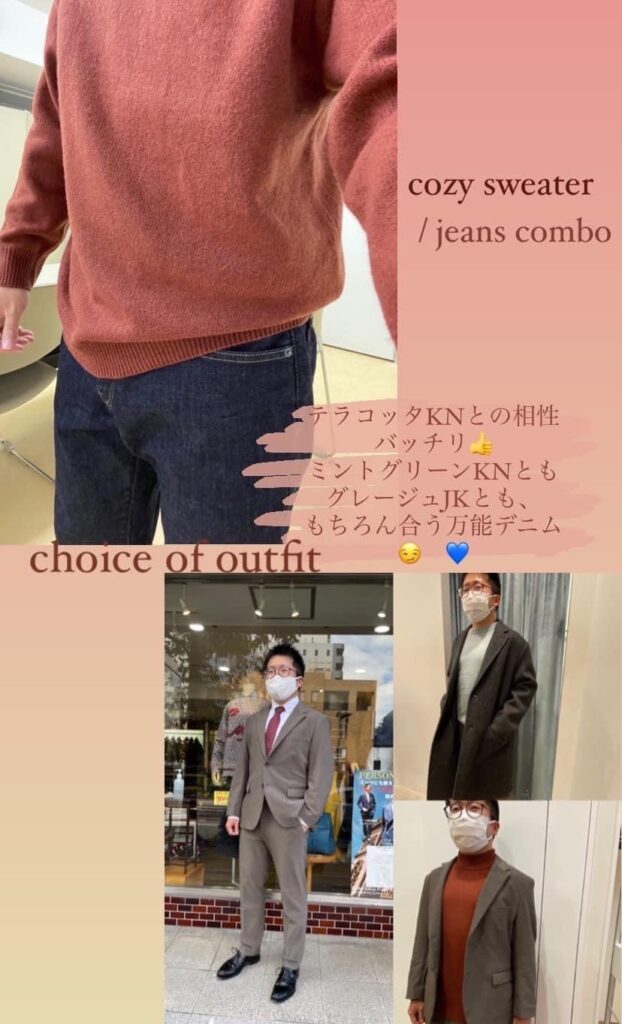 着回しアイテムとして上のパターンにボトムスをデニムで合わせても、セットアップで着られる時にテラコッタニットでも使い回しができるようにチョイス。