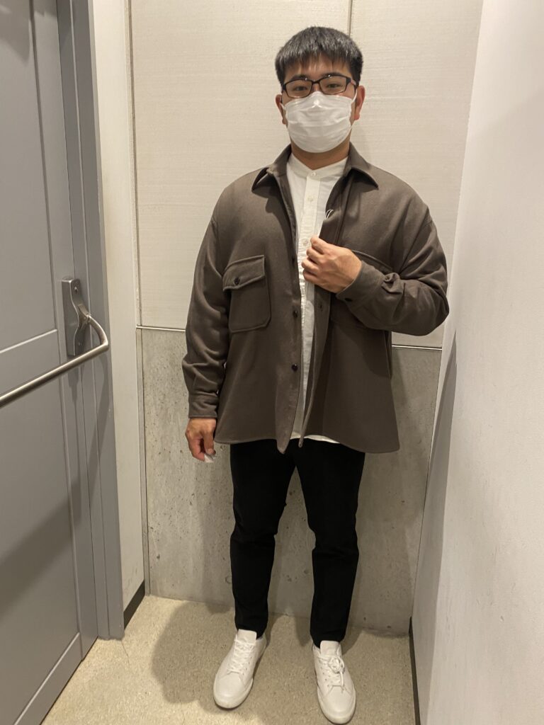 アウター(コート・ダウン)は暑いから着たくないそうでウールジャケット、ボトムスのチャコールグレーウエストゴムパンツを着回しアイテムにインナー3点を選びました。