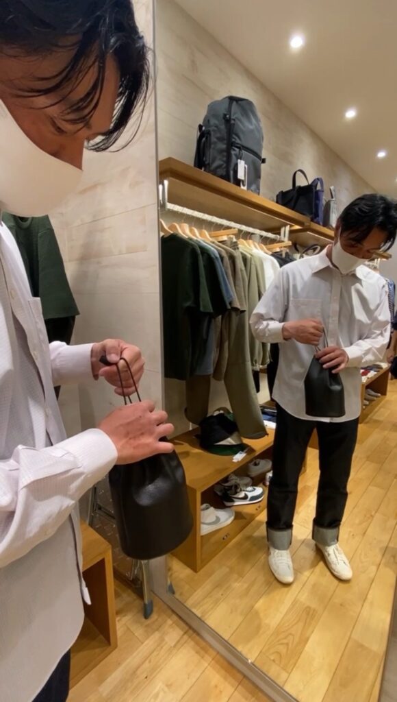 ここ数年流行りの巾着バッグ。しかもレザーで長財布もすっぽり入るサイズ。持った感じもしっくり。