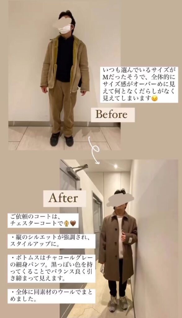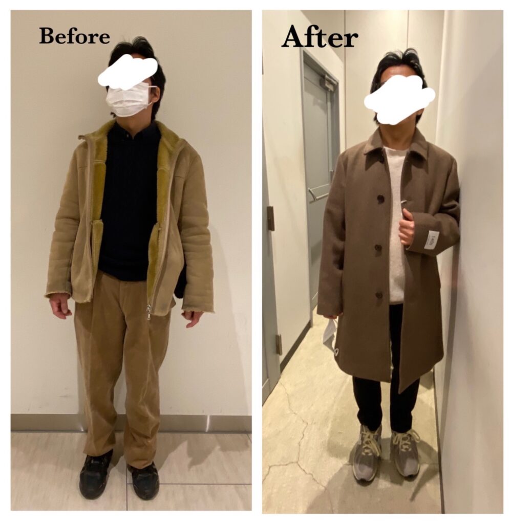 Before :今までご自身で選ばれていたサイズがMで、コートを試着する時もMでいいです。とおっしゃってましたが、肩幅・着丈・袖丈・シルエットが合っておらずSサイズで試して頂きました。